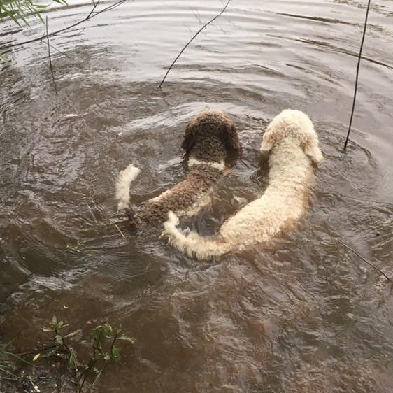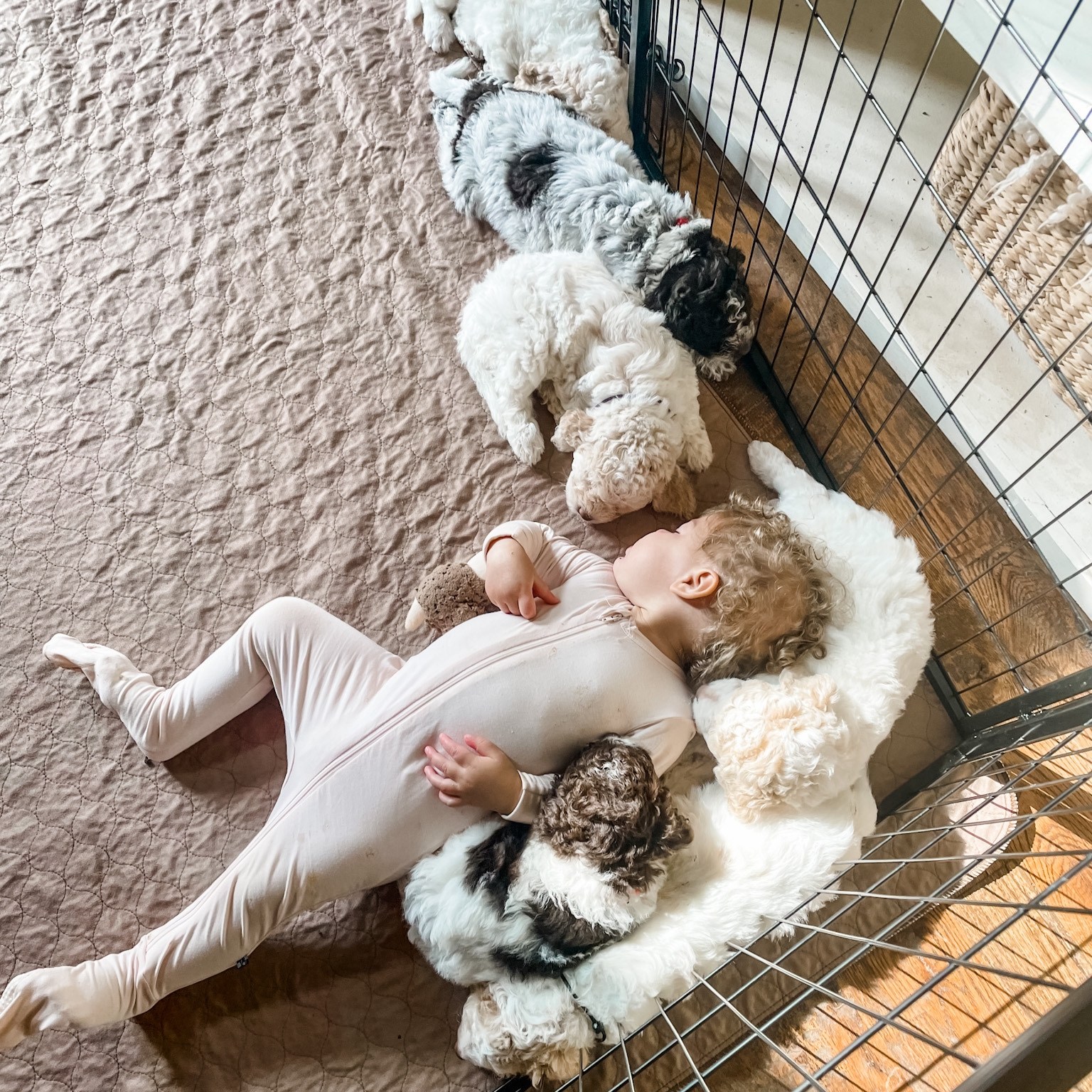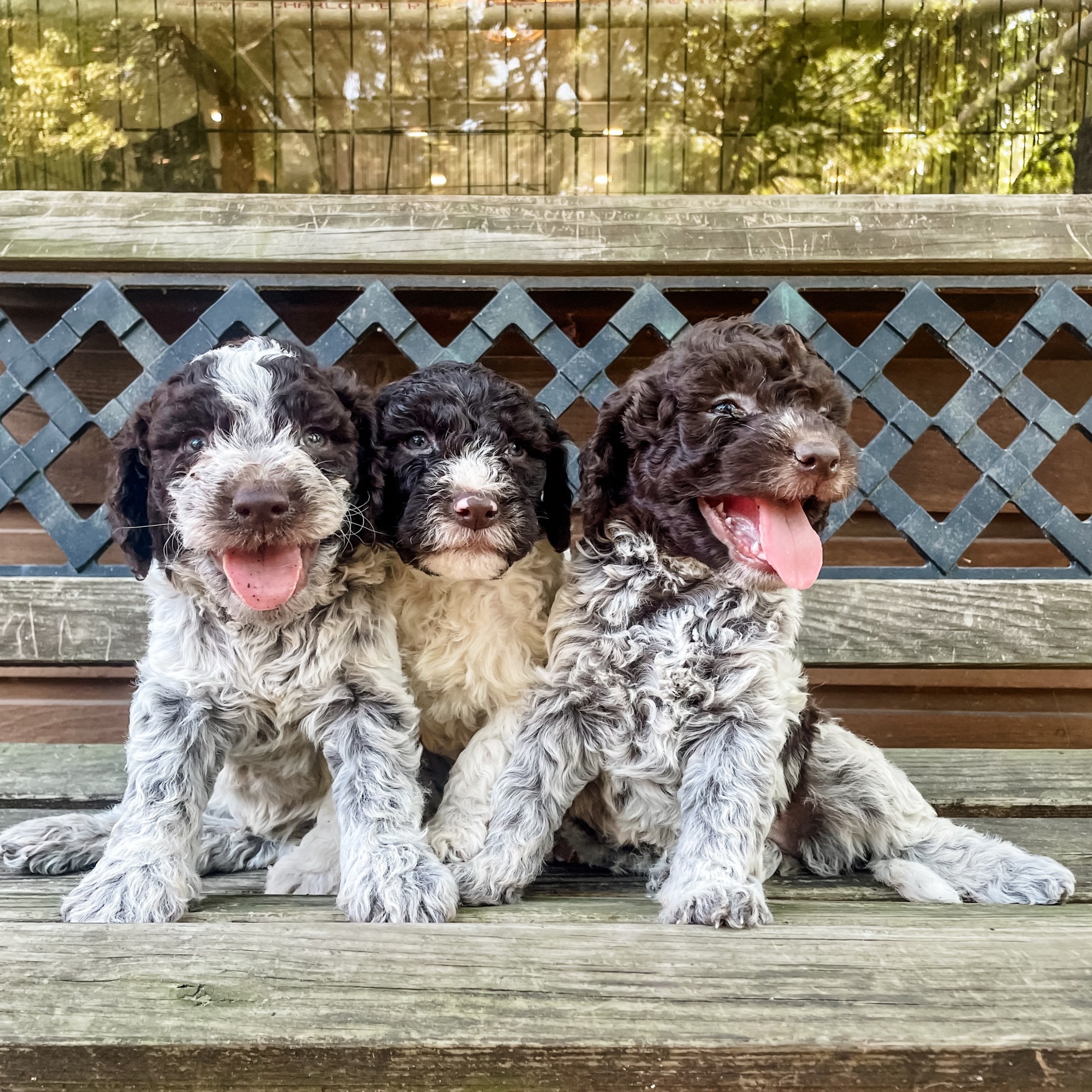 At Legacy Farms, our Spanish Water Dogs and Lagottos enjoy frolicking in our open fields, running through the creeks, and swimming in the ponds! They enjoy endless hours of playing fetch, but also enjoy laying around on the couch with our family! Our little farm is full of love and lots of playing. All of our puppies are raised in our home with our kids and grandkids, so we can ensure that once they are ready for your home you will have a great addition to the family. We take great pride in how we raise our puppies, as well as their parents.